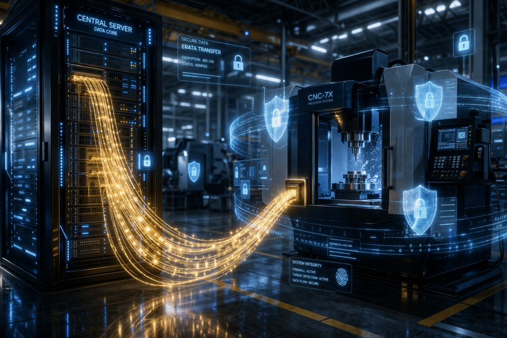Isso simplifica drasticamente a configuração de firewalls. Redes com políticas rigorosas de segurança podem integrar as máquinas de usinagem sem dor de cabeça, pois não há compartilhamentos SMB envolvidos e nenhum acesso direto ao sistema de arquivos do CNC. A superfície de ataque é reduzida a praticamente zero, alinhando a fábrica aos mais rígidos princípios de segurança IT/OT (Information Technology / Operational Technology).